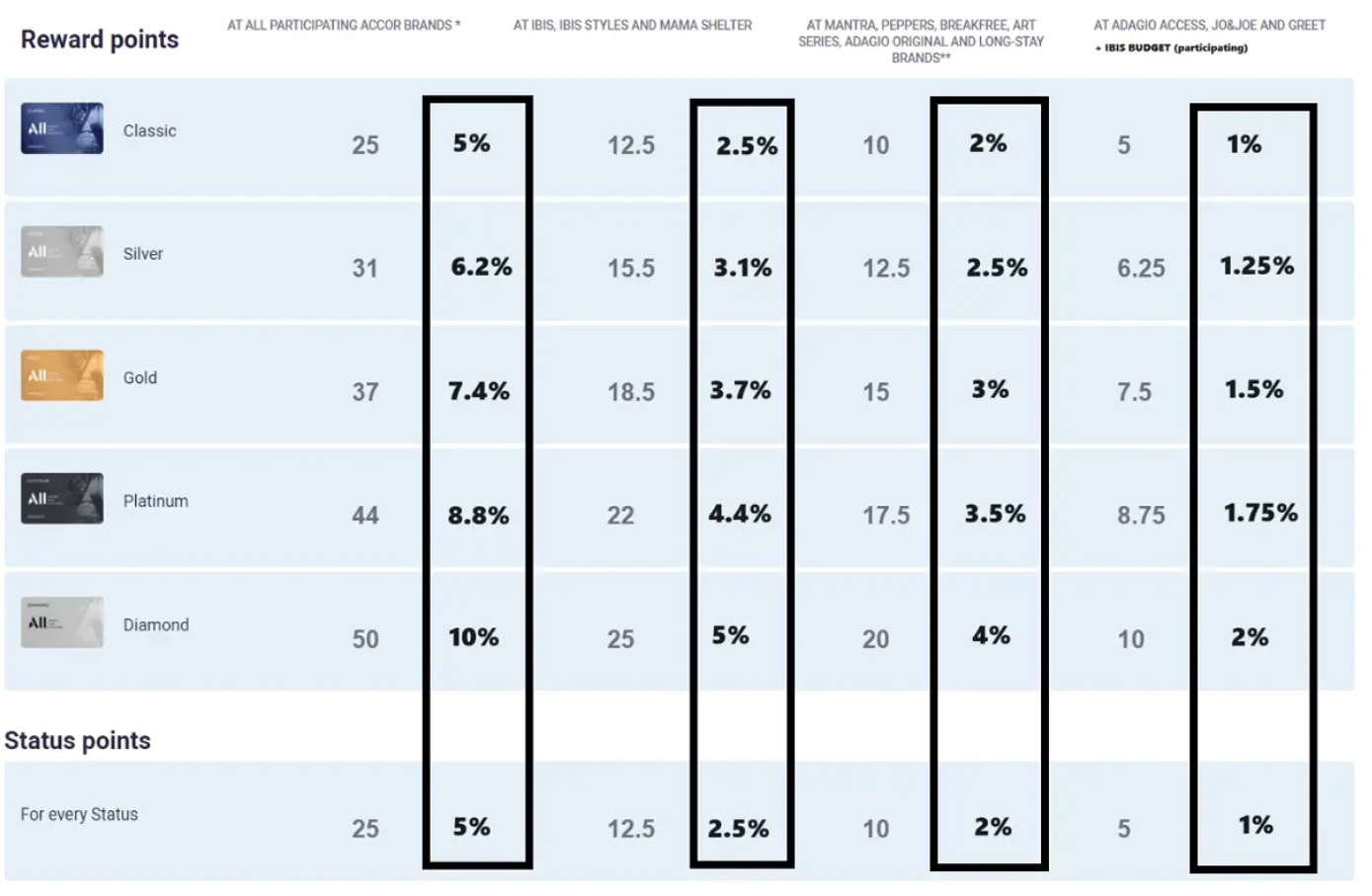 根据上面的表格,在赚取雅高的基本积分取决于您入住的品牌。在此优惠下,只有基点翻了四倍。这意味着您在雅高普通员资格下可赚取20%的房价积分,在钻石级别则可赚取25%的积分。